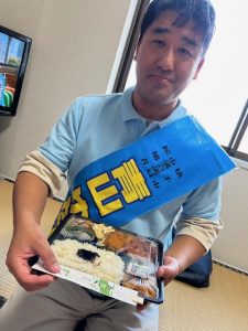 選挙事務所での弁当は同級生実家の食堂につくっていただいています。ありがたいメッセージ付きです。
